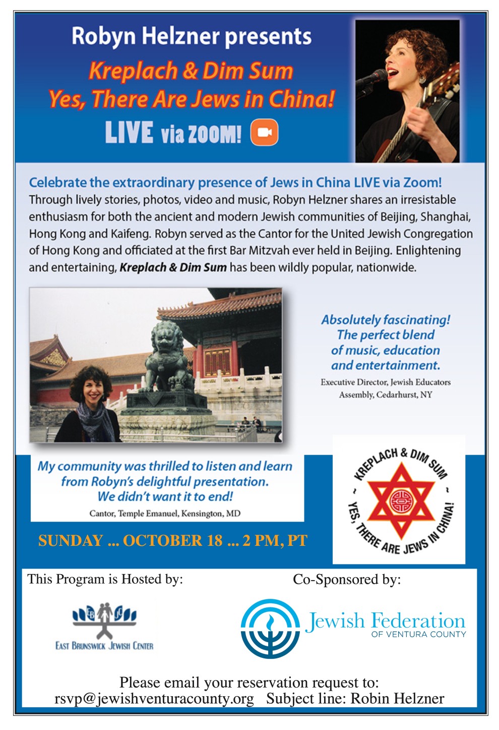 Celebrate the extraordinary presence of Jews in China via Zoom! Through lively stories, photos, videos and music, Robin Helzner shares an irresistible enthusiasm for both the ancient and modern Jewish communities of Beijing, Shanghai, Hong Kong and Kaifeng.