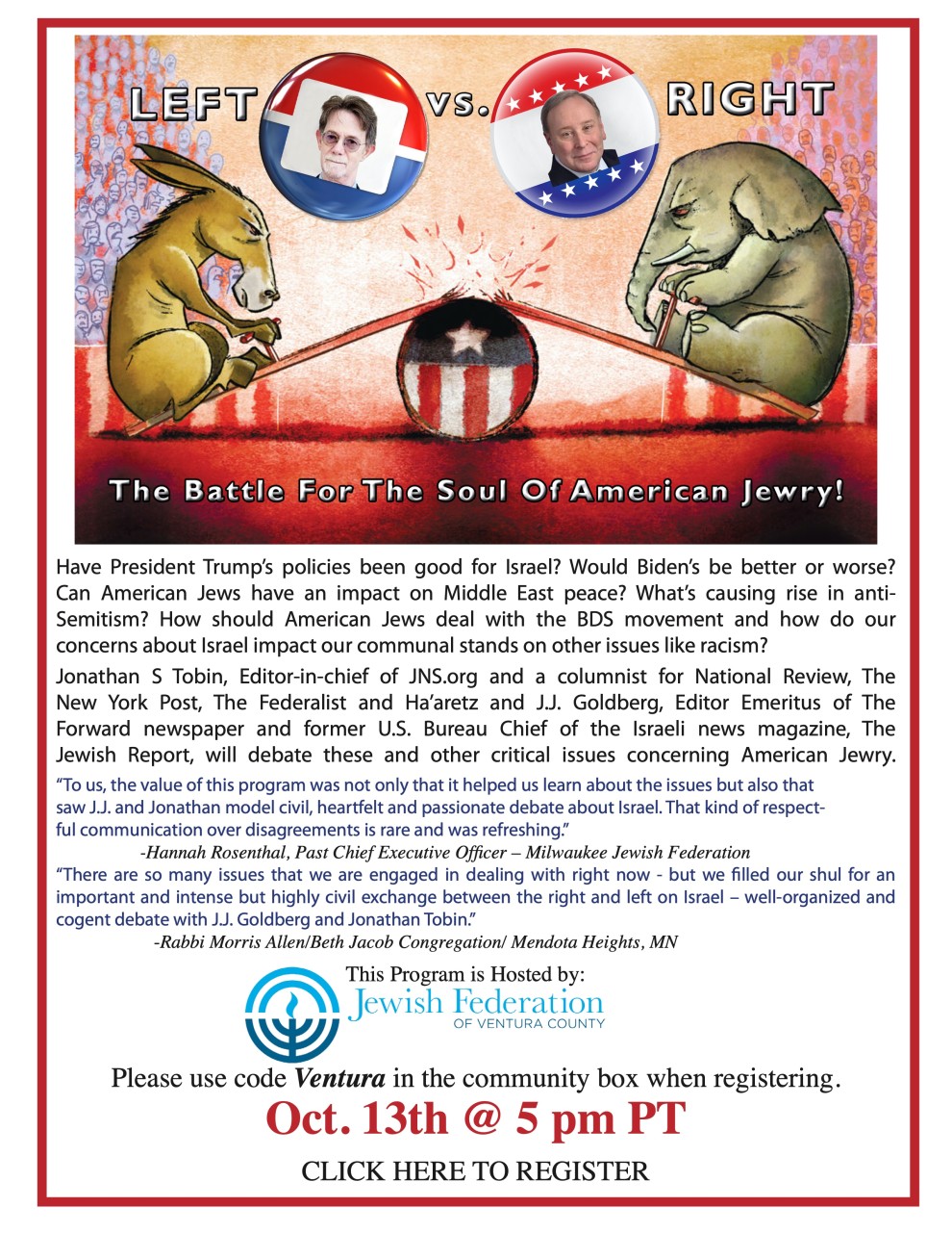 Jonathan S Tobin, Editor-in-chief of JNS.org and a columnist for National Review, The New York Post, The Federalist and Ha’aretz and J.J. Goldberg, Editor Emeritus of The Forward newspaper and former U.S. Bureau Chief of the Israeli news magazine, The Jewish Report, will debate these and other critical issues concerning American Jewry.